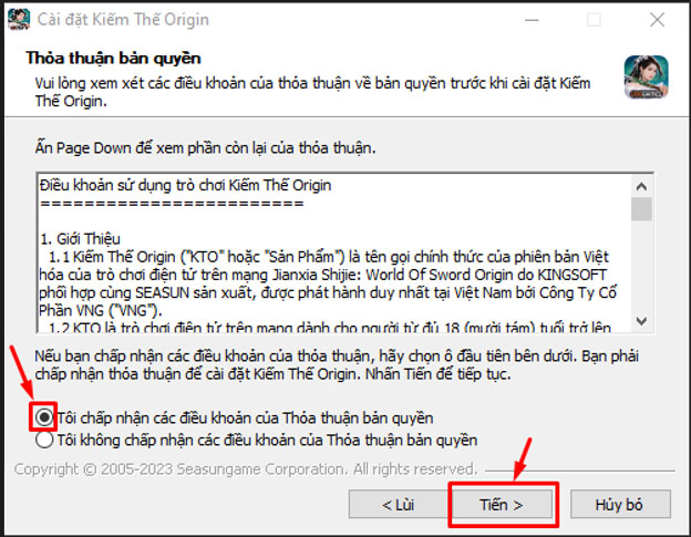 - Bước 3: Chọn chấp nhận các điều khoản và Thỏa thuận bản quyền, sau đó nhấn nút Tiến.