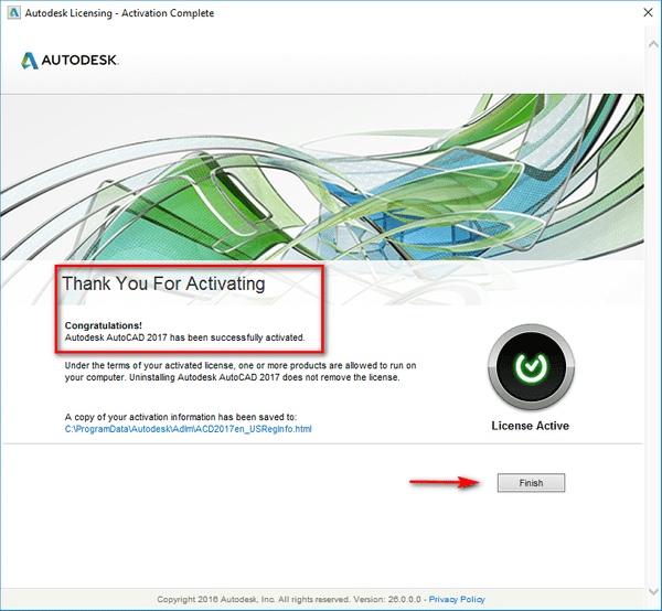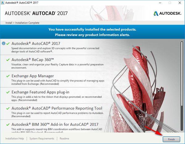 Bước 5: Sau khi quá trình Crack thành công sẽ xuất hiện hình như bên dưới. Lúc này bạn chọn ‘Finish’ và sử dụng Autocad 2017 thôi.