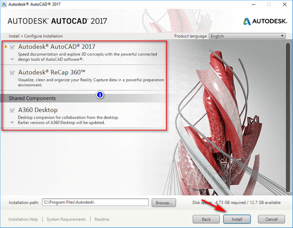 Bước 3: Bỏ dấu tích ở 2 phần ‘autodesk recap’ và ‘A360 desktop’ nếu hai phần mệt này bạn không dùng đến. Sau đó Click chọn ‘Install’.