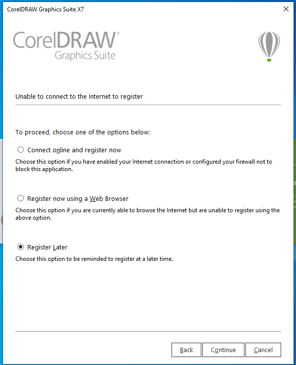 Nhấn biểu tượng CorelX7 ngoài màn hình desktop, 1 bảng thông báo hiện lên. Chọn register Later và nhấn Continue